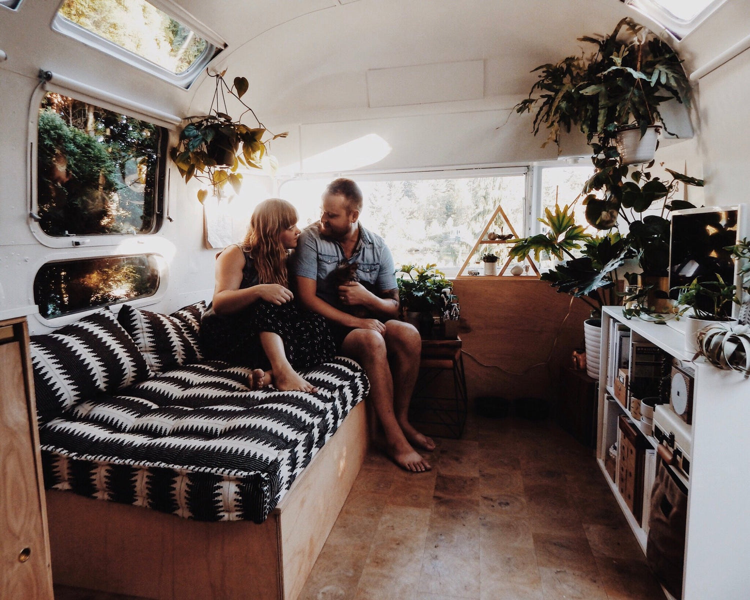 In 2013, we met at a coffee shop in Seattle and were married six months later. Since then, we’ve lived in a Volkswagen van, an apartment with pink carpet, and a vintage airstream we restored together.