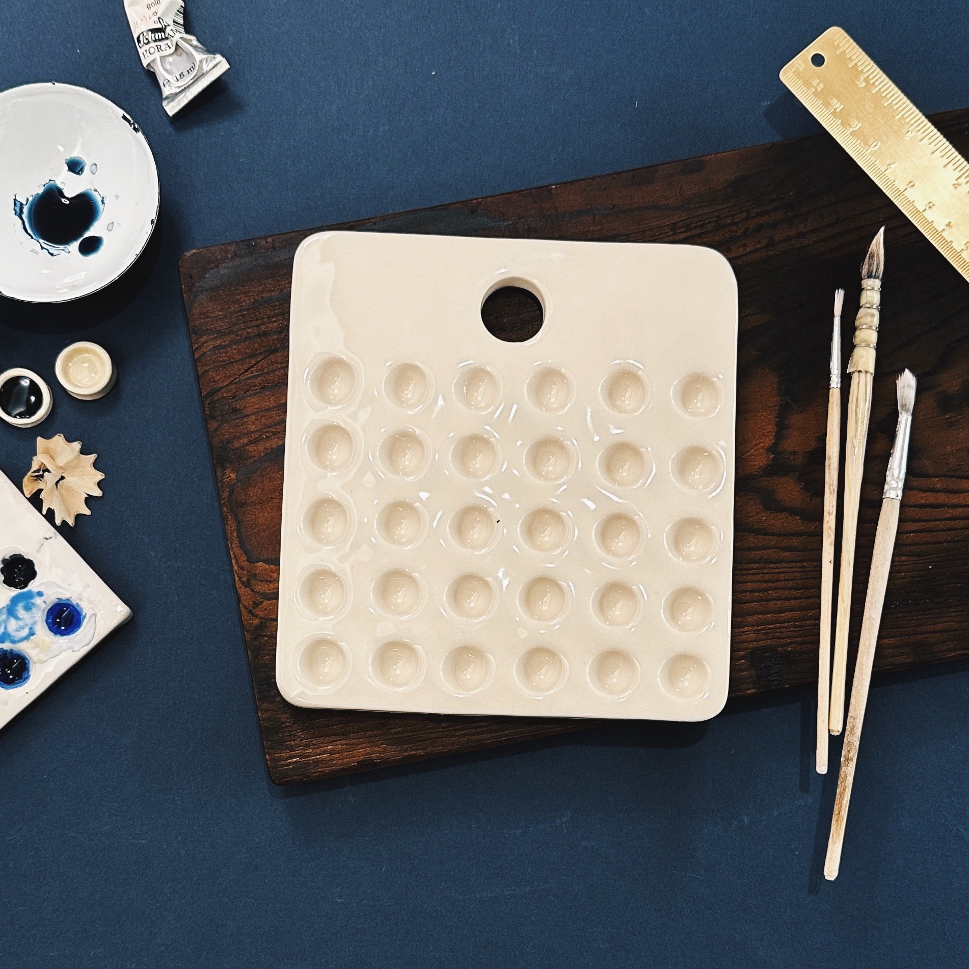 Handmade ceramic paint tray made from white stoneware clay, coated with a choice of two beautiful glazes, with hole for comfort grip (or hanging when not in use). Perfect for your favorite gouache, oil, acrylic, or watercolors. Approximately 6 1/4” x 6 3/4”.