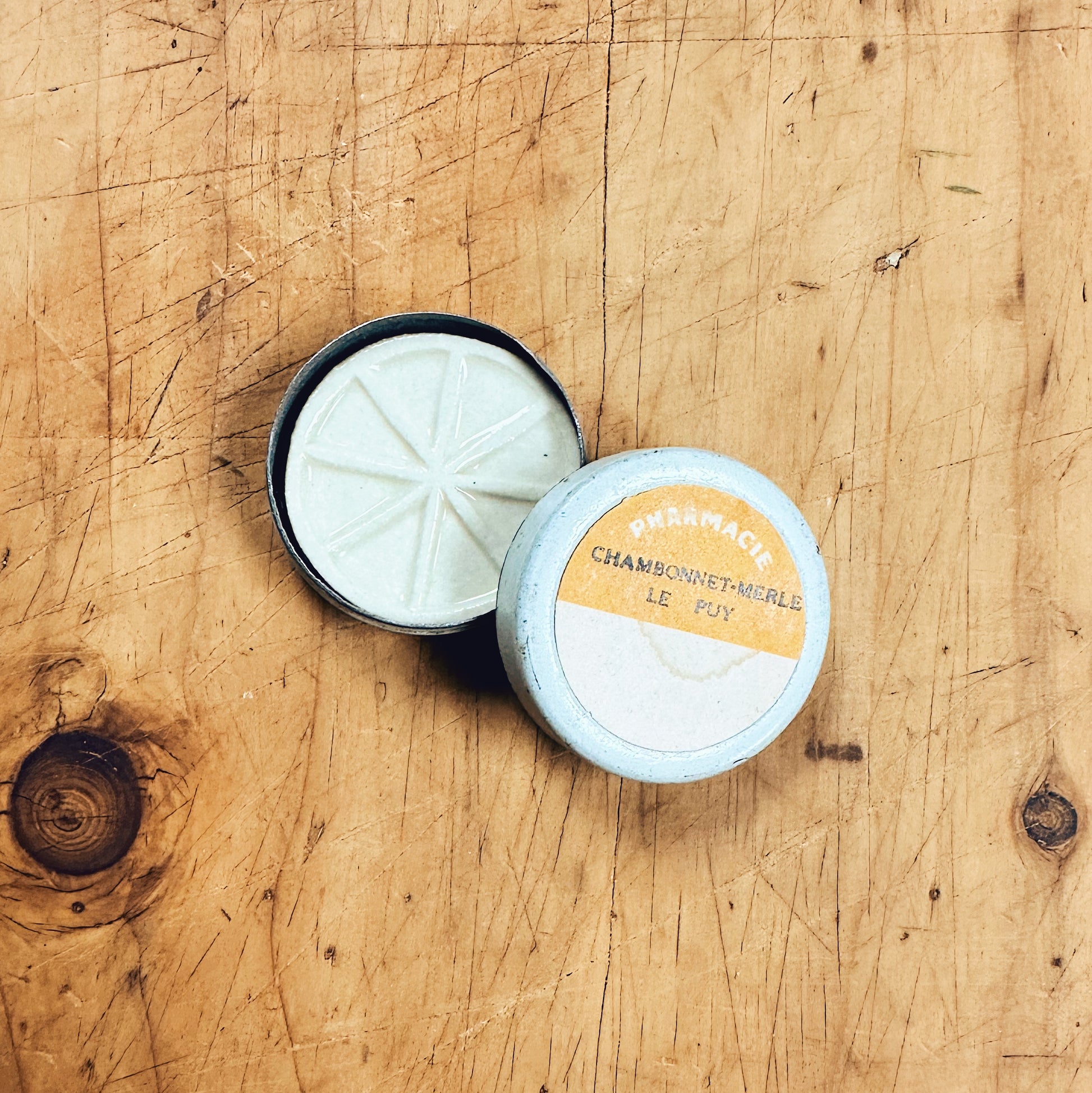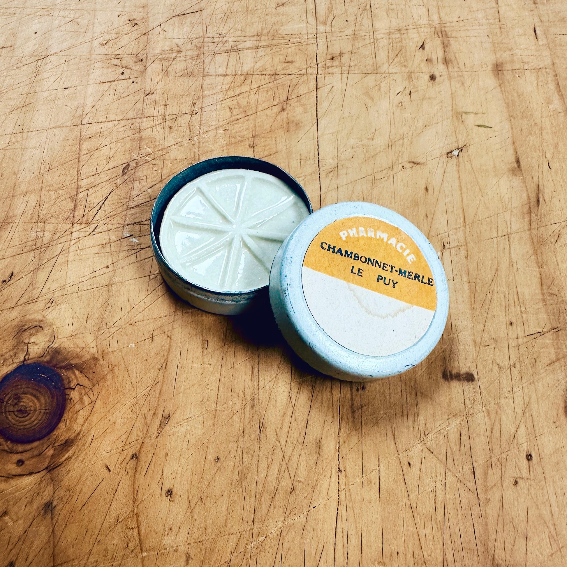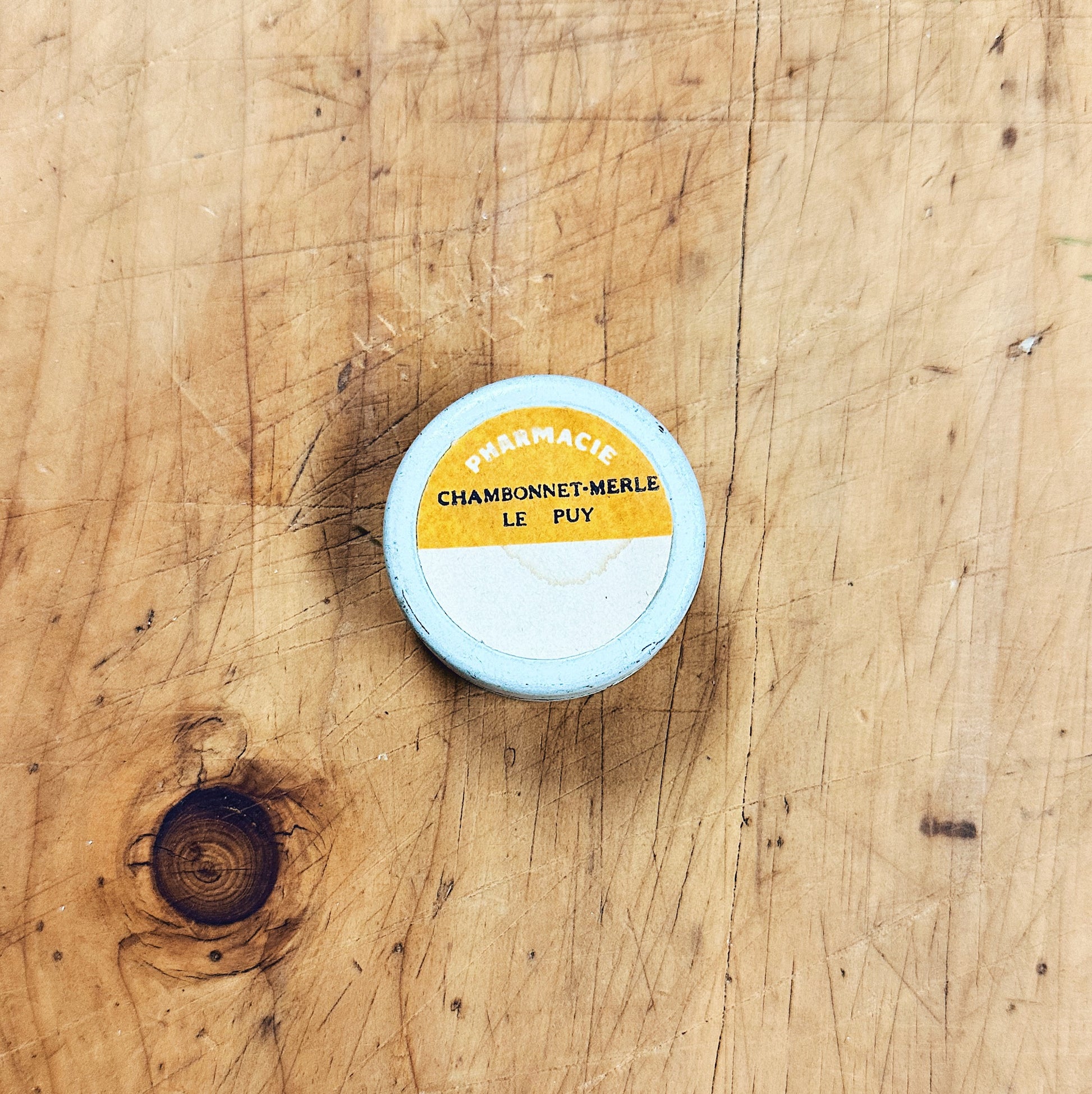 Vintage tins that we picked up during our wanderings at the Paris flea markets. Then we carefully made a custom travel palette to fit each one. Frosted with our buttermilk glaze to give it a perfectly vintage feel. Tin measures approximately 1 3/4" across.