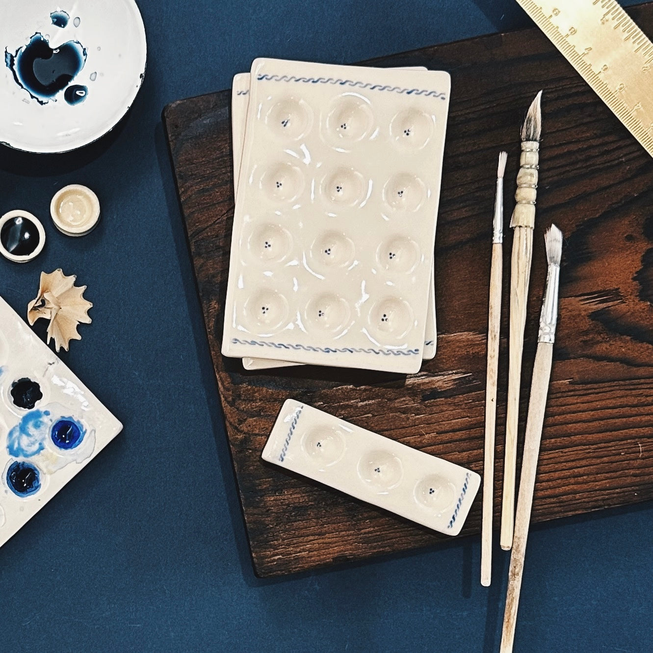 Handmade ceramic paint tray made from a smooth white stoneware clay, hand-embellished in Delft blue by Natasha and then coated with a beautiful eggshell buttermilk glaze. Perfect for your favorite gouache, oil, acrylic, or watercolors. 3-Pan measures approximately 1" x 3 1/4”, and the 12-Pan measures approximately 3" x 4 1/2".