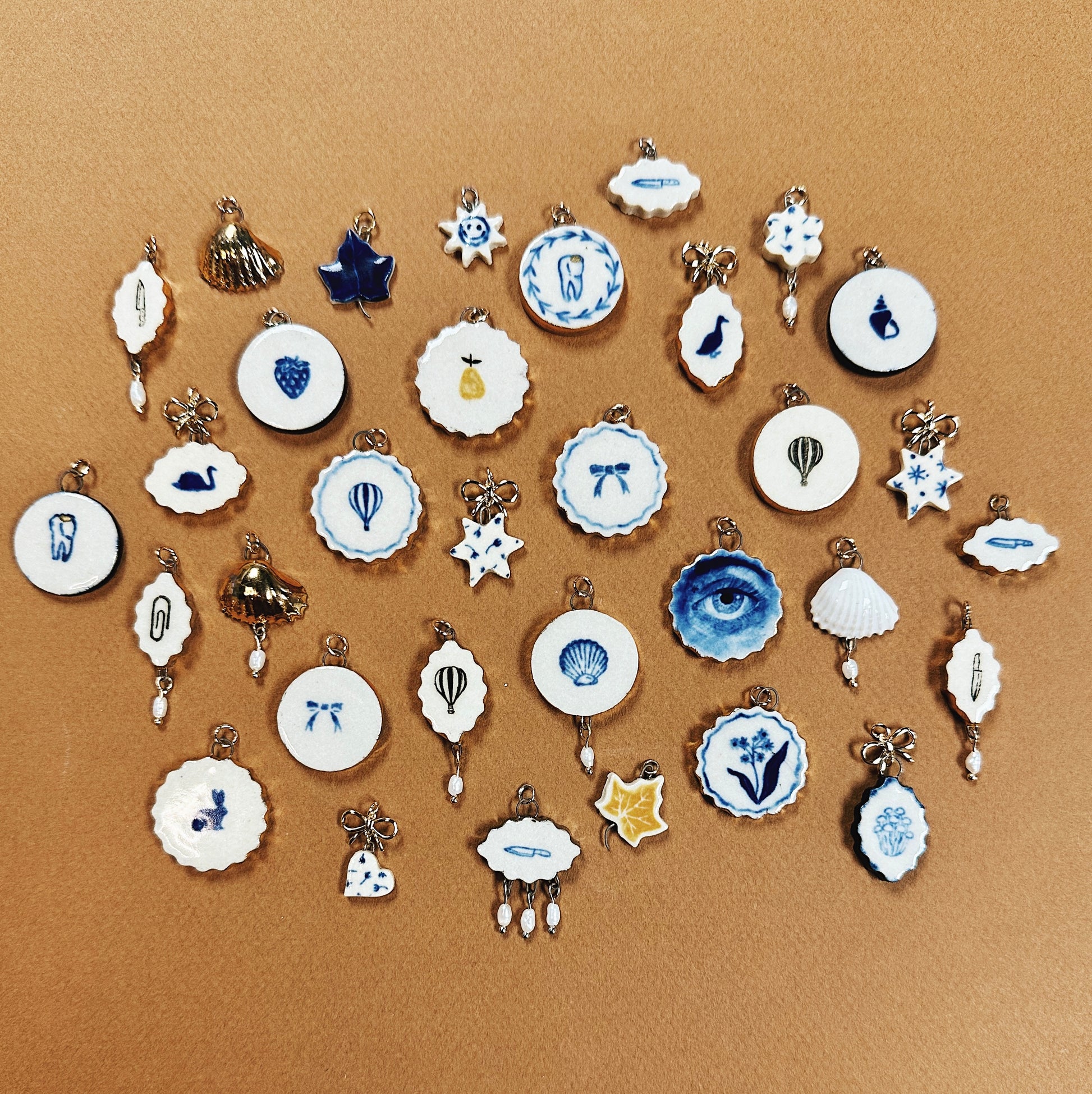 Handmade assorted charms inspired by our Parisian wanderings. Cut, fired and delicately (sometimes excruciatingly) hand-painted by Natasha in our Nova Scotia studio. Select charms are embellished with 10k real gold lustre, and/or vintage freshwater pearls. Perfect for a necklace pendant, charm bracelet, earrings, or bag charm.