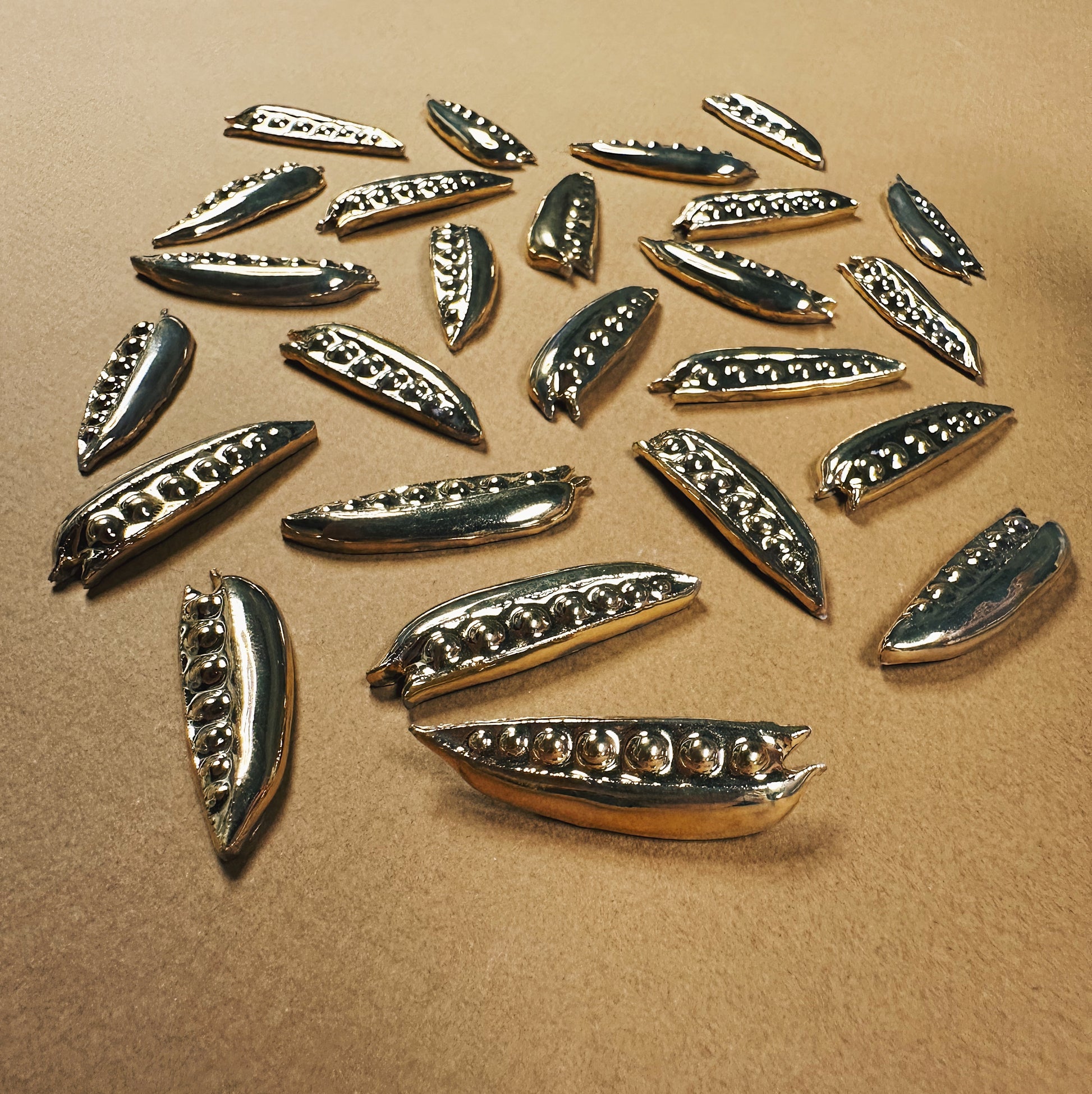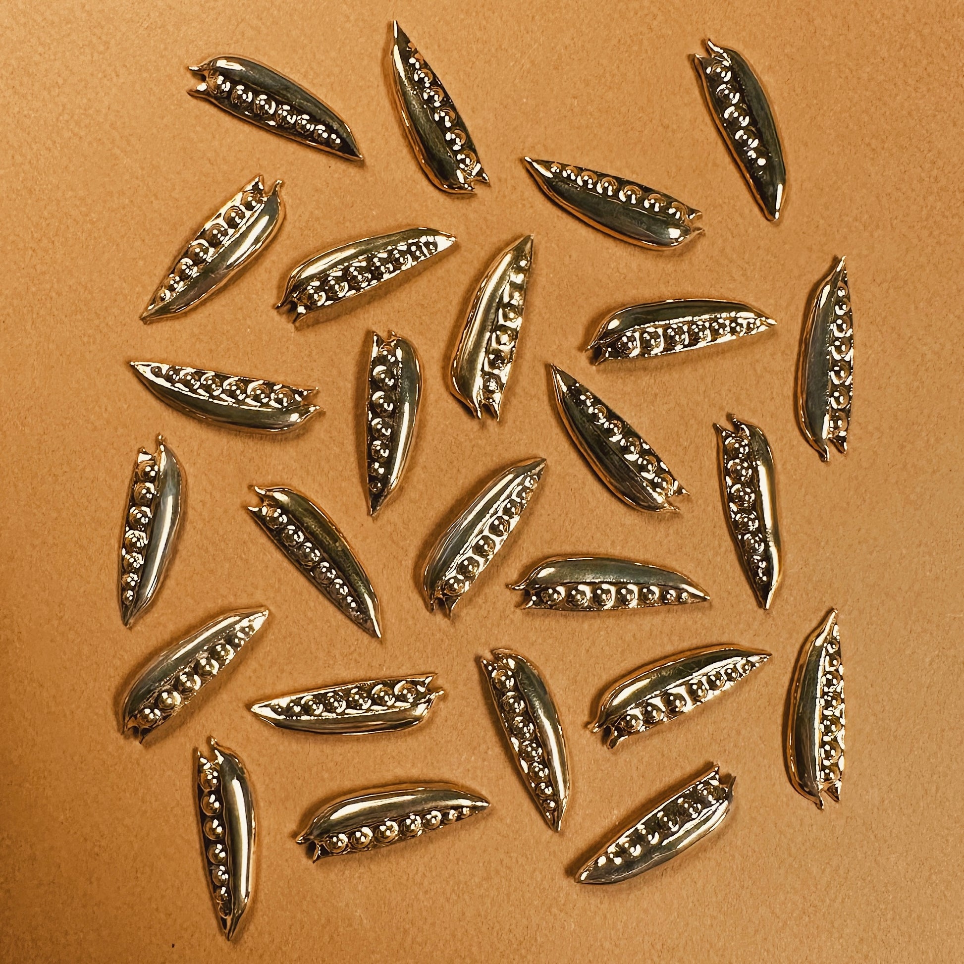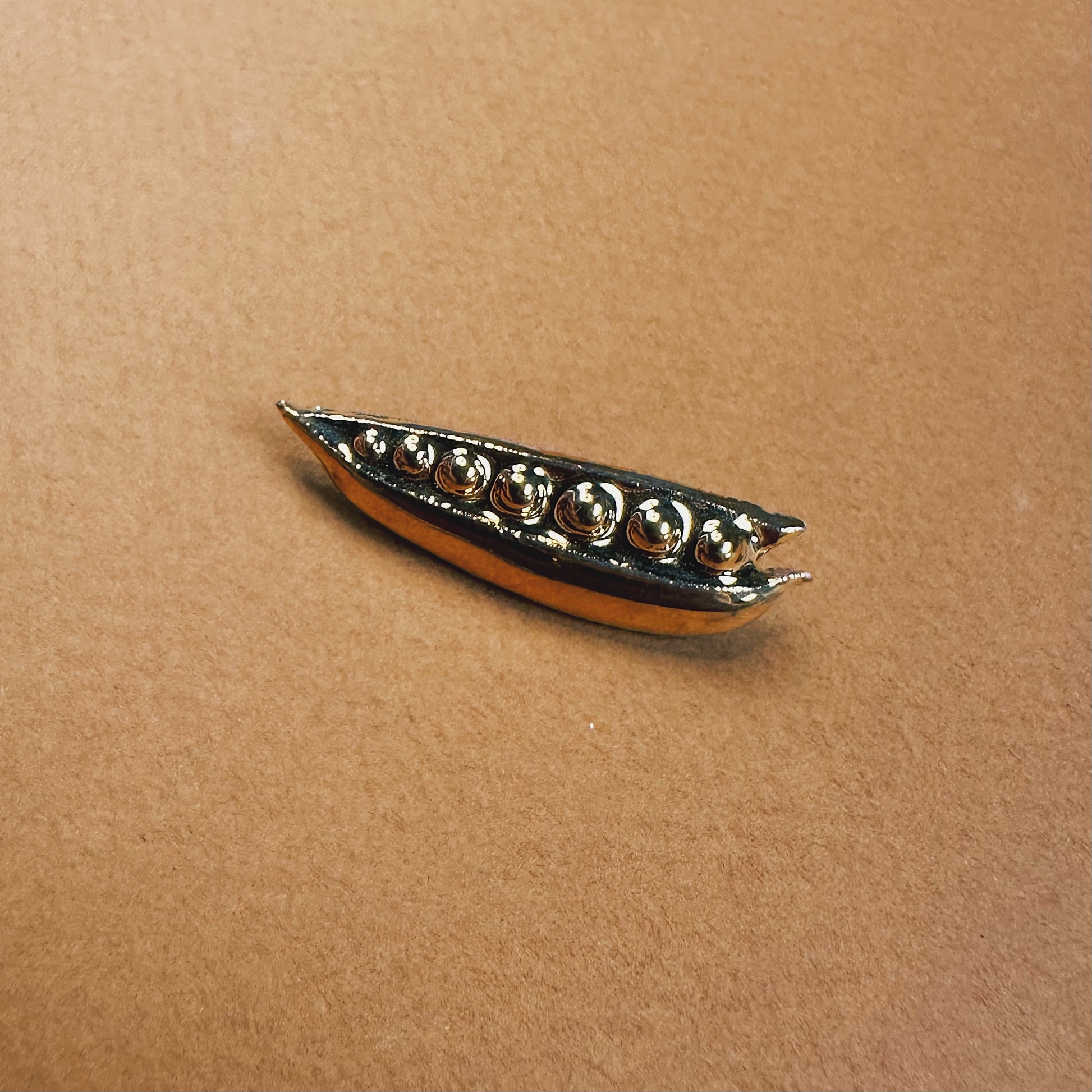 Handmade “petits pois” pea pod broaches with 10k real gold lustre and pin backing, inspired by our wandering around Paris. Measures 1 1/2" across.