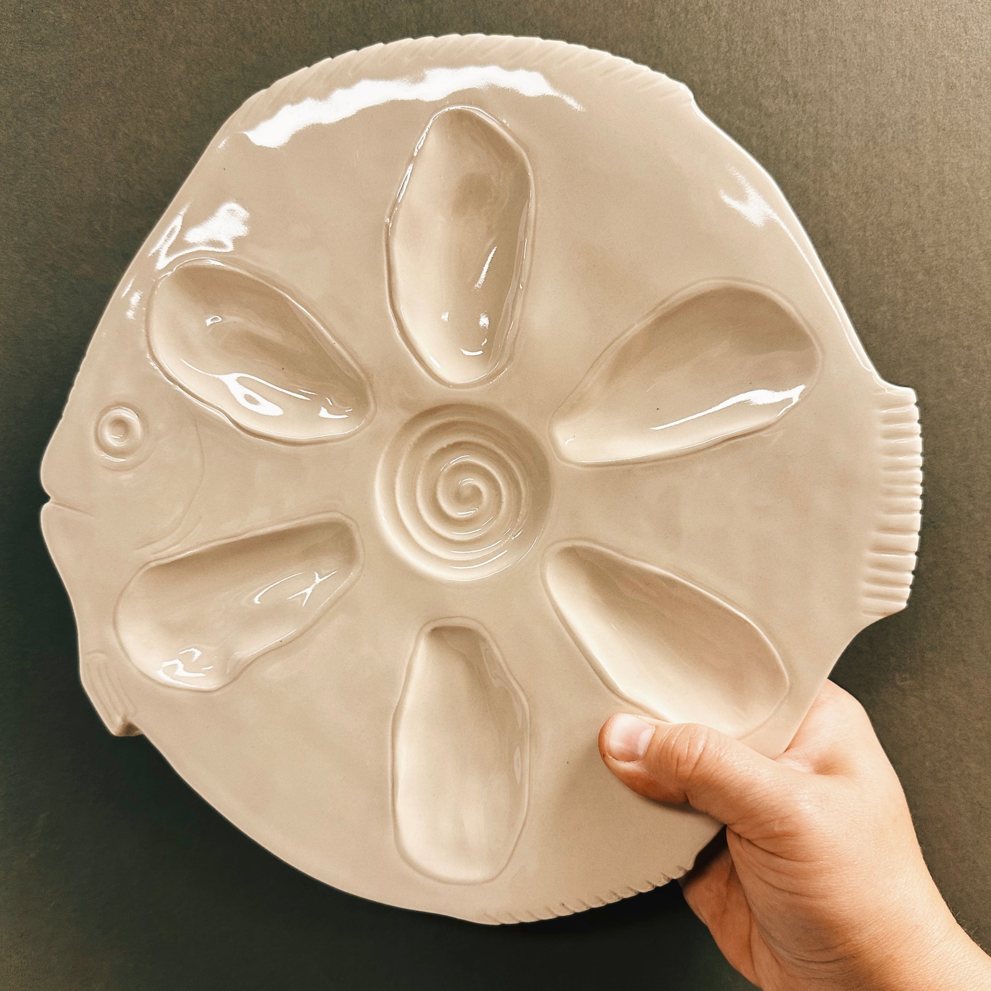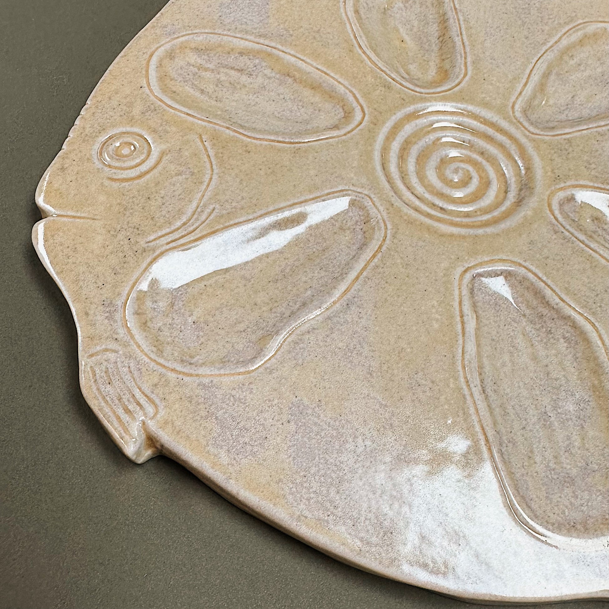 Handmade carved fish oyster plate inspired by our Parisian wanderings. Perfect for your table or as a wall plate. Hand sculpted and formed, each plate is a little different and organic, and then glazed in a carefully chosen array of glazes in our Nova Scotia studio. Measures approximately 11” across.