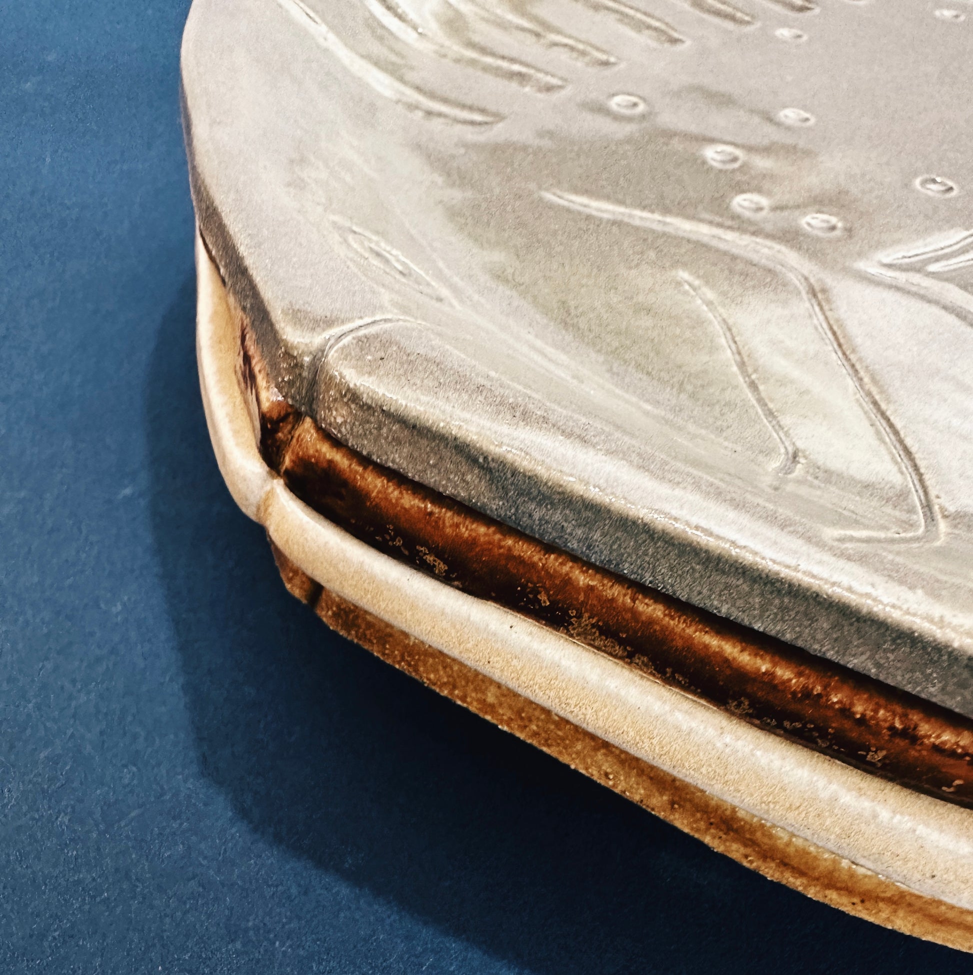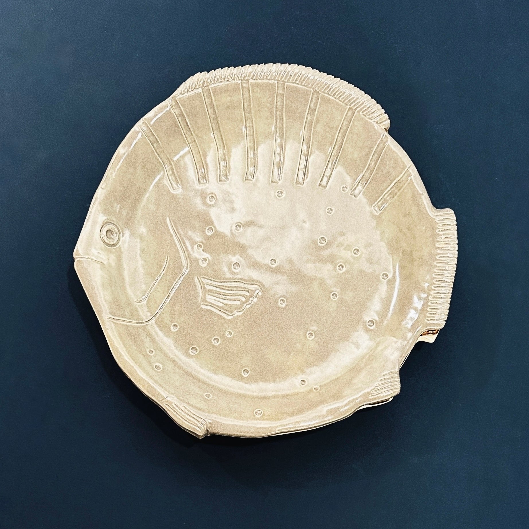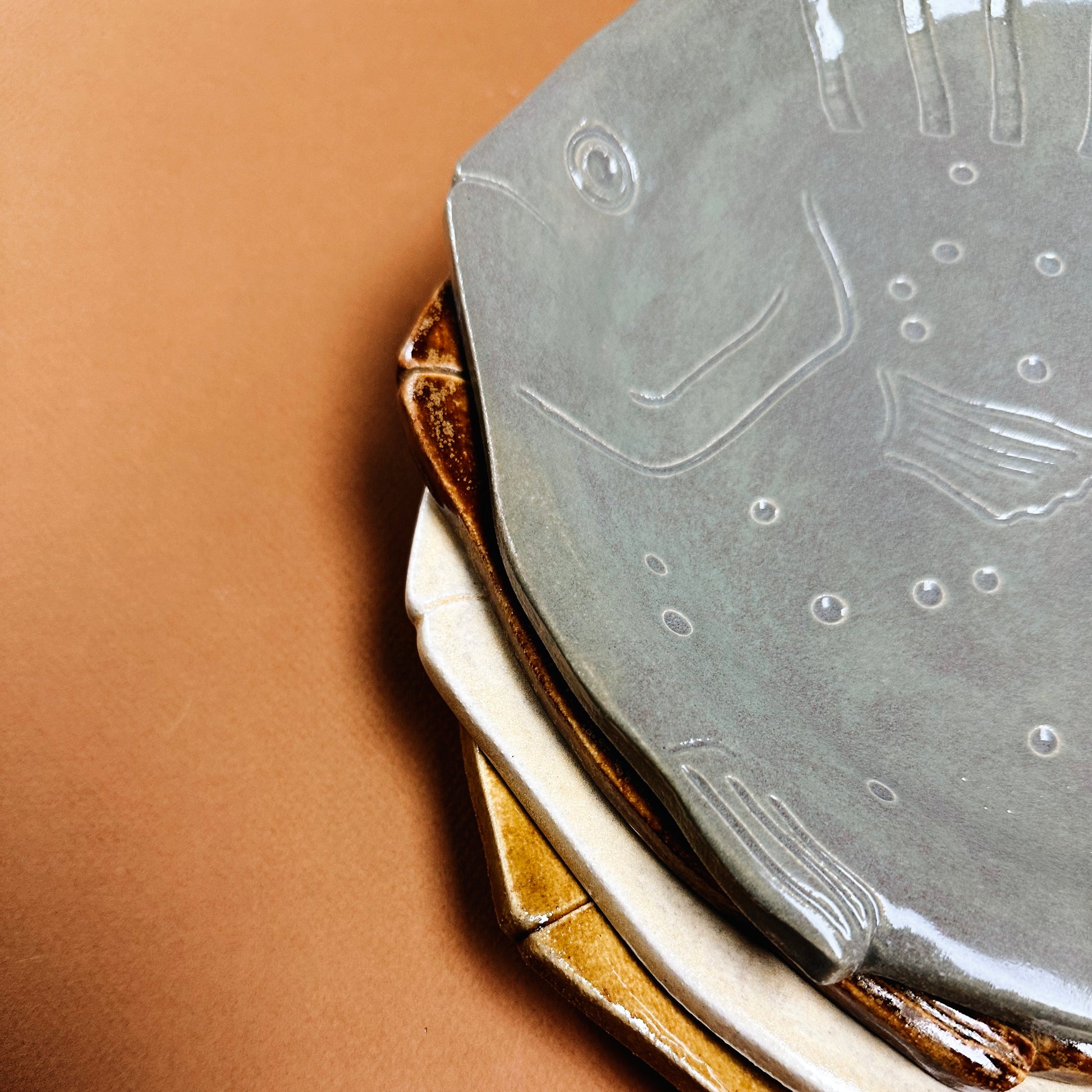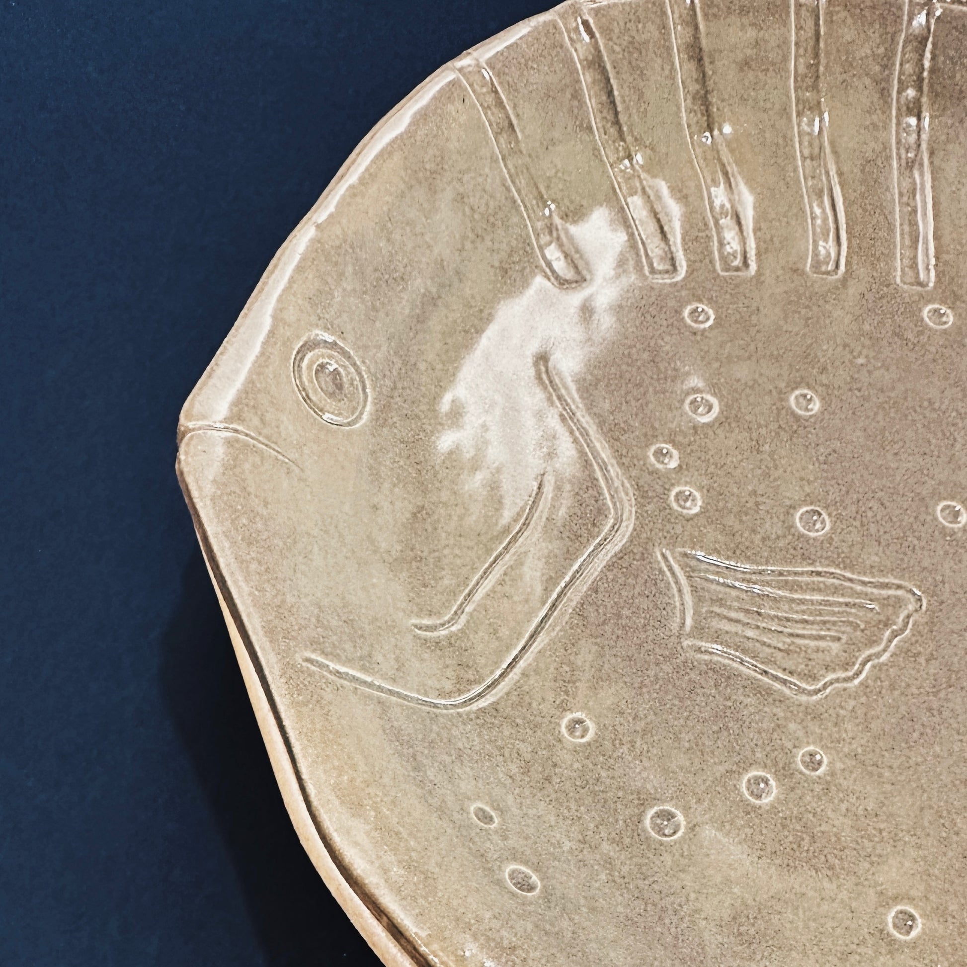 Handmade carved fish platters inspired by our Parisian wanderings. Perfect for your table or as a wall plate. Hand sculpted and formed, each plate is a little different and organic, and then glazed in a carefully chosen array of glazes in our Nova Scotia studio. Measures approximately 10 3/4” x 10 1/2”.