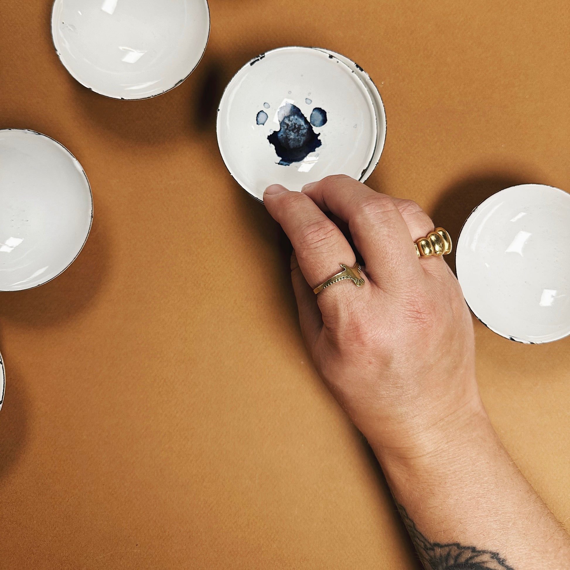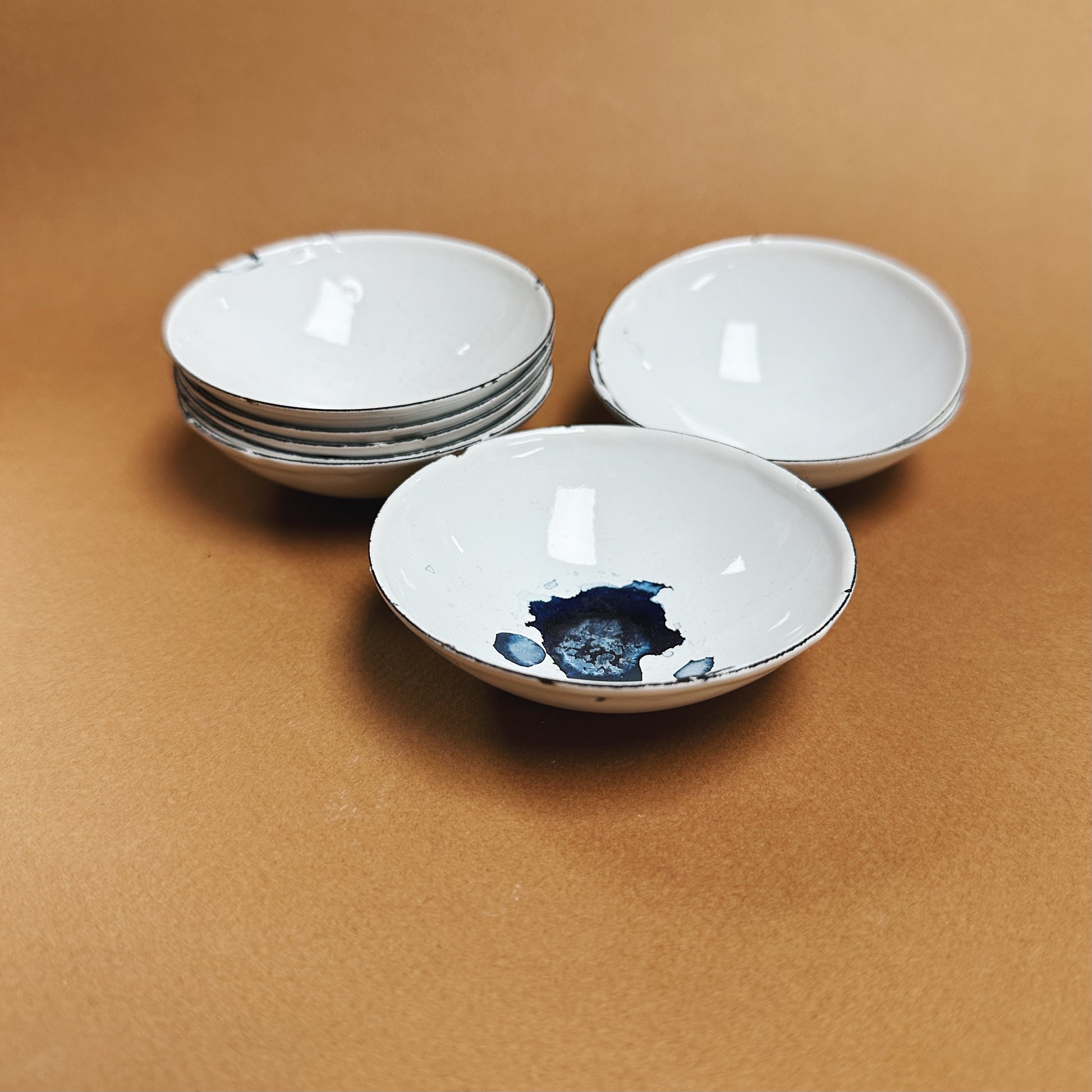 Vintage enamelware bowls that we picked up during our wanderings at the Paris flea markets. Measures 3 1/4" across. Perfect for mixing paint or storing pencil shavings or pastels.